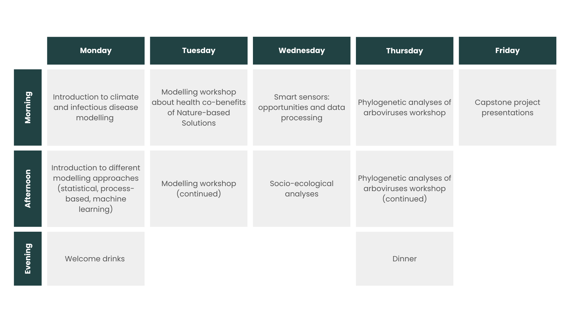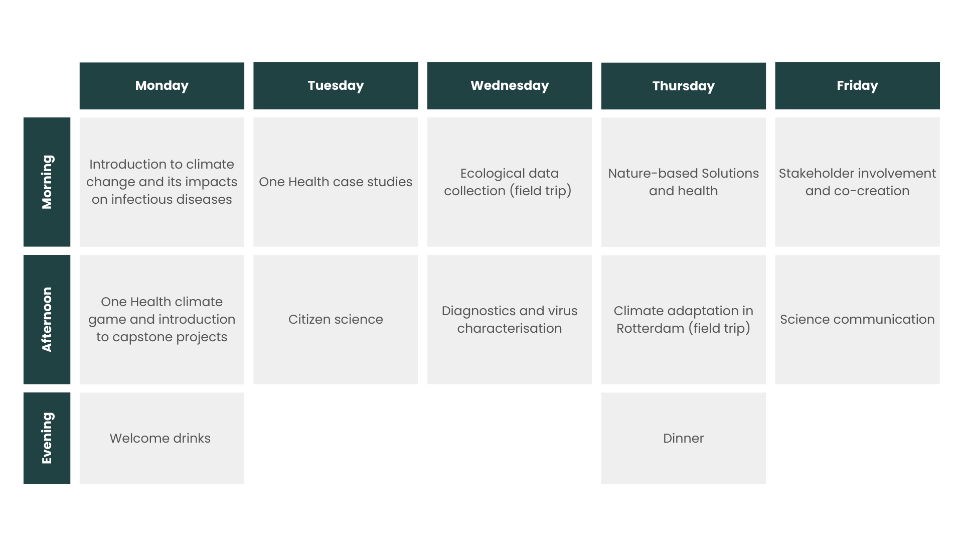 Join us in Rotterdam and Heidelberg this summer and deepen your understanding of the One Health methods and practical tools to study and address risks of infectious diseases. In this summer school, we will focus on connections between infectious diseases, Nature-based Solutions (NbS) and climate change and equip you with fieldwork, lab and modelling approaches.